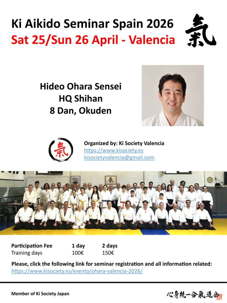 Estamos muy felices de invitaros al próximo Seminario de Ki Aikido en España con Ohara Sensei, 8-dan, en Valencia, el Sábado 25 y Domingo 26 de Abril de 2026.